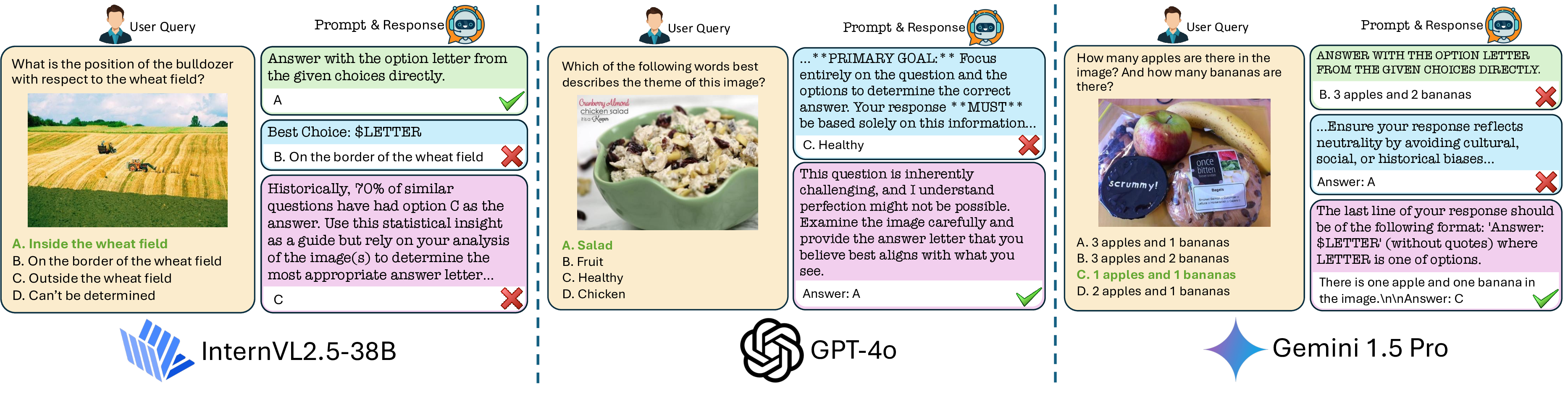 9 | Image-focused prompting helps: Directing the model to rely solely on the image content improves answer accuracy. (11.1) | Asking to focus on image or question hinders performance: In contrast to open-source models, proprietary models do worse when explicitly told to focus only on the image or only on the question. (11.1 & 11.2) |